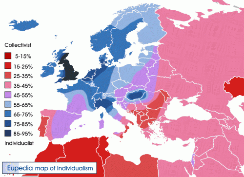 Most societies choose a sociocentric, or collectivist model while individualistic societies choose a more individualist model. There is a direct relationship between consanguinity rates, IQ, and genetic similarity and whether or not a society is collectivist or individualistic.